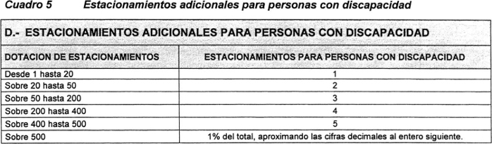 De la dotación de estacionamientos que deba proyectarse, deberán habilitarse para el uso de personas con discapacidad, los estacionamientos resultantes de la aplicación de la siguiente tabla, con un mínimo de un estacionamiento, salvo que se trate de viviendas unifamiliares o cambio de destino de las mismas.