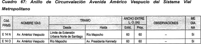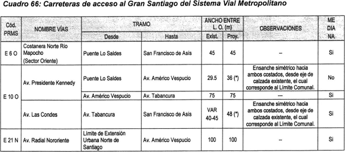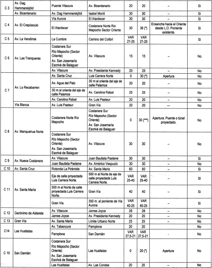 . Los cuadros a continuación detallan los listados que recogen la clasificación de las vías expresas y troncales pertenecientes al Sistema Vial Metropolitano, en el área de aplicación de la presente Ordenanza, estableciéndoles como Vialidad Estructurante.