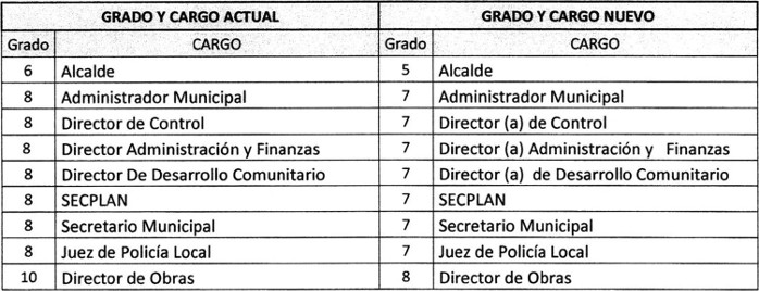 . 2.- Modifícanse los cargos y grados que se indican de acuerdo con lo señalado en el acápite IV número 10 del oficio Nº 17.773 de la CGR de fecha 13 de julio de 2018, en concordancia con lo señalado en el artículo 48º de la ley 18.695, Orgánica Constitucional de Municipalidades.