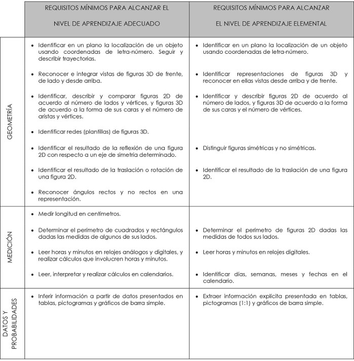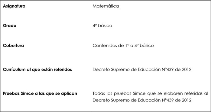 En la prueba Simce, muestran evidencia de que comprenden los conceptos y procedimientos básicos(³) de números y operaciones, patrones y álgebra, geometría, medición y datos y probabilidades propios del periodo. Asimismo, muestran generalmente que son capaces de aplicar dichos conocimientos y las habilidades matemáticas de resolver problemas, representar, modelar y argumentar en situaciones directas y en problemas rutinarios en los que se requiere seleccionar datos, organizar la información o establecer un procedimiento apropiado.