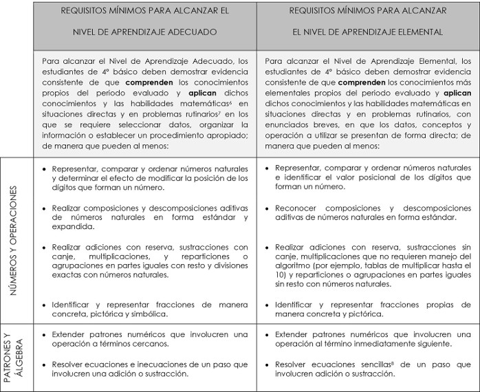 Los estudiantes de 4º básico que alcanzan el Nivel de Aprendizaje Adecuado han adquirido de manera satisfactoria(1) los conocimientos y habilidades matemáticos definidos en el Currículum vigente para el periodo evaluado(²).