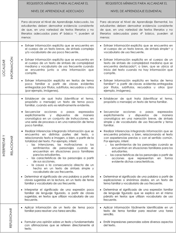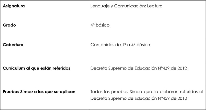 En la prueba Simce, muestran evidencia de que, al leer una variedad de textos literarios y no literarios apropiados para 4° básico, son capaces de: localizar información explícita que resulta fácil de encontrar; realizar interpretaciones y relaciones sencillas para establecer de qué trata un texto, secuenciar acciones, realizar inferencias y determinar el significado de palabras y de expresiones en lenguaje figurado; y reflexionar sobre la lectura para resolver tareas sencillas aplicando información fácilmente identificable en el texto y para emitir impresiones personales sobre diversos aspectos de lo leído.