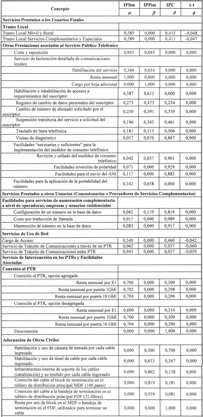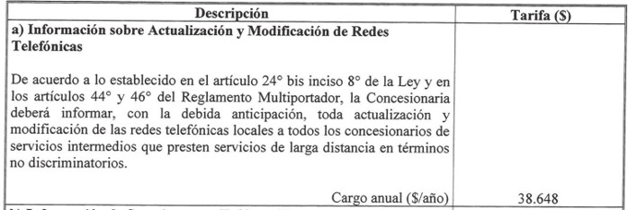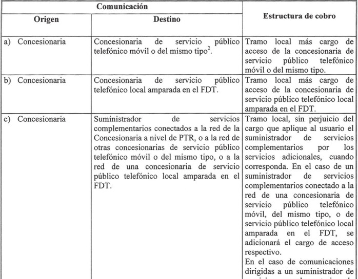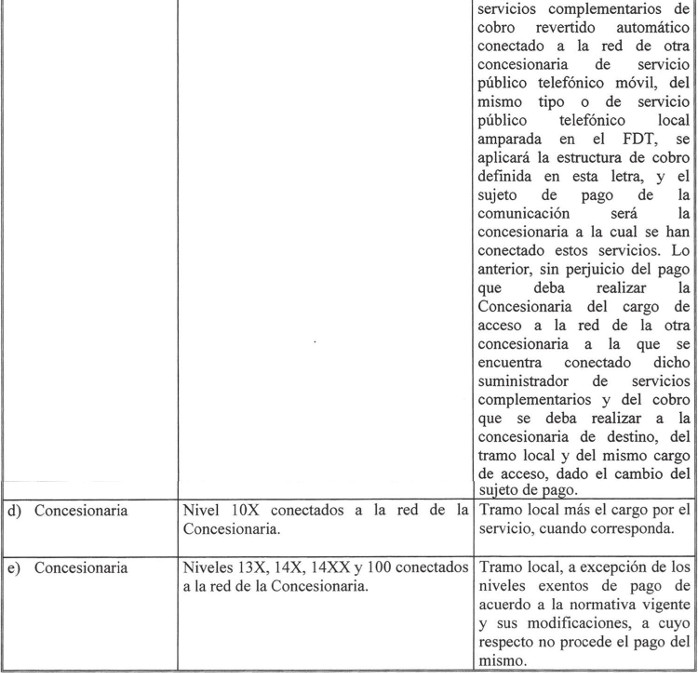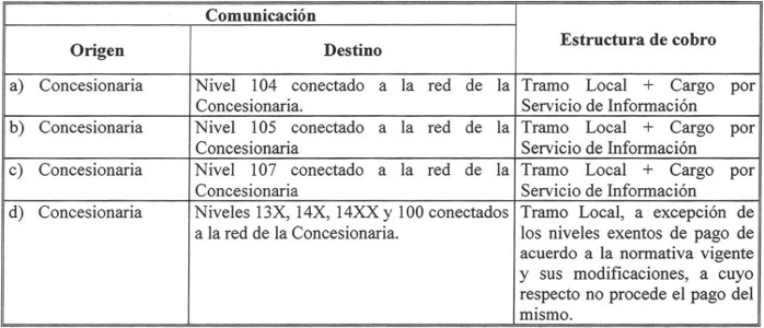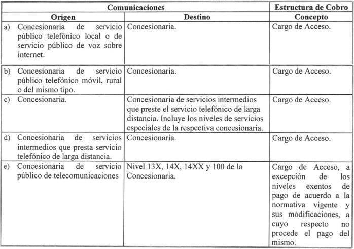 La estructura de cobro para el Cargo de Acceso, aplicado a concesionarias, que provean servicios de telecomunicaciones en los casos particulares que se señalan a continuación, será la siguiente: