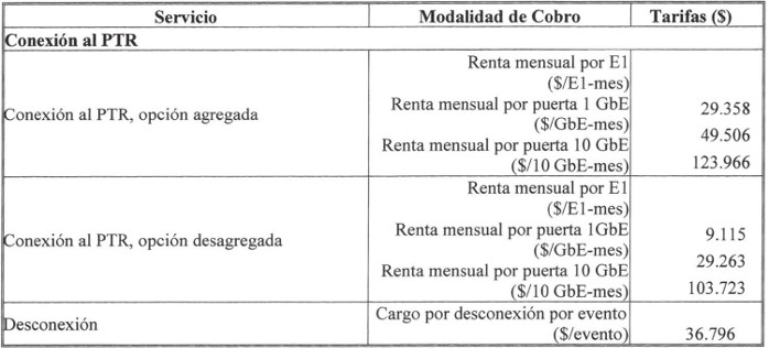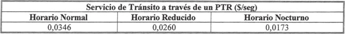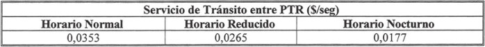 El nivel de las tarifas del servicio de tránsito de comunicaciones entre PTRs, expresados en valores netos, es el siguiente: