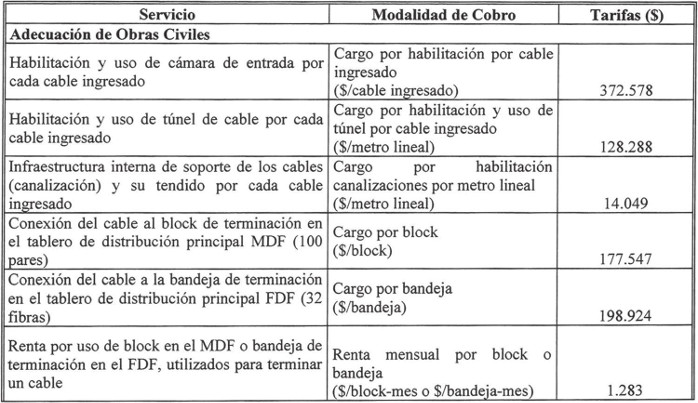 El nivel de las tarifas del servicio adecuación de obras civiles, expresadas en valores netos, es el siguiente: