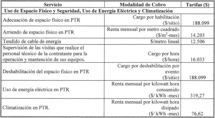 El nivel de las tarifas del servicio uso de espacio físico y seguridad, uso de energía eléctrica y climatización, expresado en valores netos, es el siguiente:
