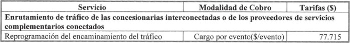 El nivel de las tarifas del servicio enrutamiento de tráfico de las concesionarias interconectadas o de los proveedores de servicios complementarios conectados, expresado en valores netos, es el siguiente: