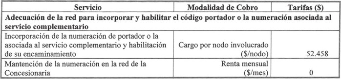 El nivel de las tarifas del servicio de adecuación de la red para incorporar y habilitar el código portador o la numeración asociada al servicio complementario, expresado en valores netos, es el siguiente: