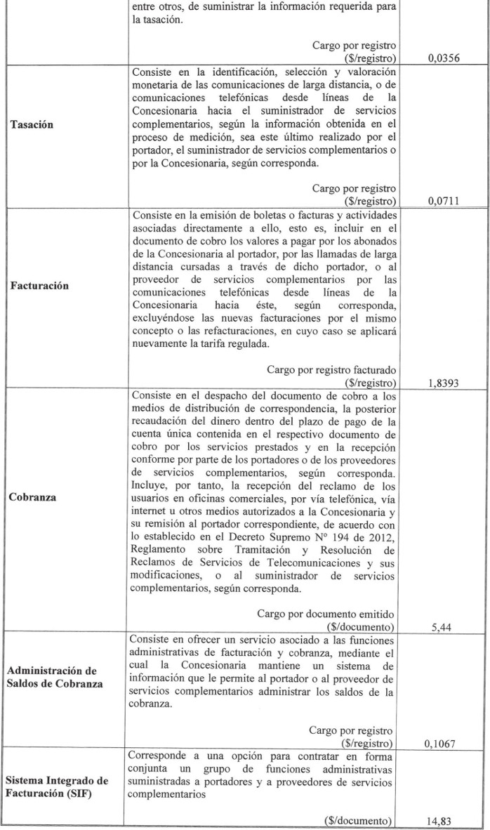 Además, en atención a lo establecido por el artículo 24° bis inciso 5° de la Ley y por el artículo 42° del Reglamento Multiportador, la Concesionaria deberá prestar las funciones de medición, tasación, facturación y cobranza por el servicio de larga distancia a aquellos portadores que así lo requieran, contratando todas o parte de tales funciones, facilidades que también deben hacerse extensivas a los proveedores de servicios complementarios en virtud de la antedicha resolución. La contratación integrada de las funciones administrativas corresponderá a la agregación de los servicios individuales necesarios para el cumplimiento de la normativa indicada.