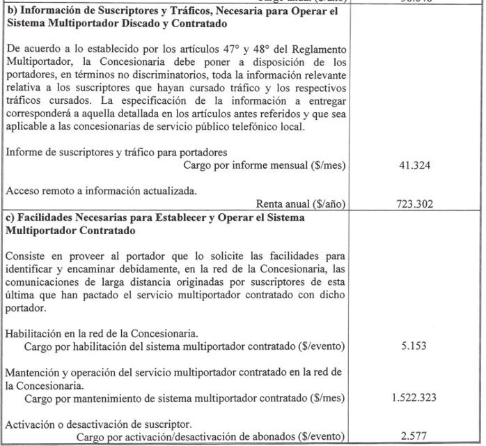 De acuerdo a lo establecido en el artículo 24° bis de la ley y el artículo 23° del decreto supremo N° 189, de 1994, que establece el Reglamento para el Sistema de Multiportador Discado y Contratado del Servicio Telefónico de Larga Distancia, en adelante, Reglamento Multiportador, y a lo establecido en su oportunidad por la ex Comisión Resolutiva mediante la resolución N° 686, de 2003, la Concesionaria deberá ofrecer, dar y proporcionar a todos los concesionarios de servicios intermedios que presten servicios de larga distancia, así como a proveedores de servicios complementarios, en igualdad de condiciones económicas, comerciales, técnicas y de información, las facilidades que sean necesarias para establecer y operar el sistema multiportador discado y contratado.