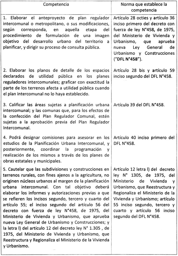 h) Que, además, a la Secretaría Regional Ministerial de Vivienda y Urbanismo le corresponde calificar "en cada caso: a) Las Áreas sujetas a Planificación Urbana intercomunal; b) Las comunas que, para los efectos de la confección del Plan Regulador Comunal, estén sujetas a la aprobación previa del Plan Regulador Intercomunal", de conformidad a lo establecido en el artículo 39 del decreto con fuerza de ley N° 458, de 1975, del Ministerio de Vivienda y Urbanismo, que aprueba nueva Ley General de Urbanismo y Construcciones. Igualmente, esta competencia se identifica con aquellas referidas a la planificación territorial intercomunal que se traspasará a los gobiernos regionales.