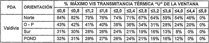 Tabla 1. Porcentaje máximo de superficie de ventanas según orientación y valor Resolución 1197 EXENTA,