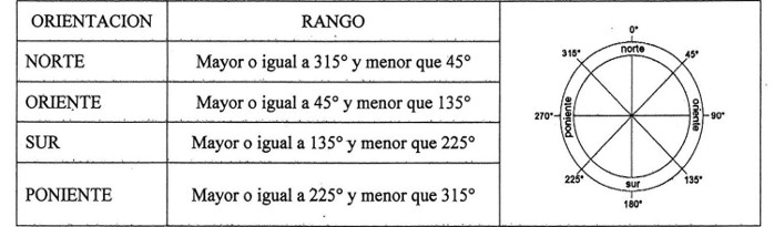 a) Identificar las orientaciones correspondientes a los paramentos verticales de la envolvente. Se deberá determinar la orientación predominante para cada muro perimetral de la unidad habitacional a partir de la dirección de su normal, expresada en grados sexagesimales. La dirección 0º estará definida por el norte geográfico, por lo que las orientaciones estarán limitadas de acuerdo a lo establecido en la Tabla 2.