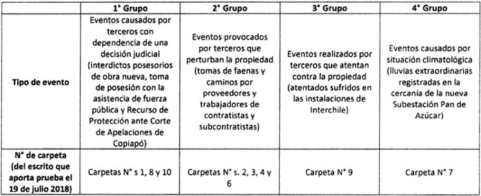 22. Que, con la finalidad de explicar de mejor manera los eventos constitutivos de caso fortuito o fuerza mayor acreditados en el expediente administrativo que se mencionan en su presentación del considerando anterior, ISA ordena los hechos u obstáculos en 4 grandes grupos, en atención a la reacción desplegada por ella a efectos de disminuir sus impactos, clasificándolos según la siguiente tabla: