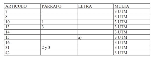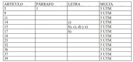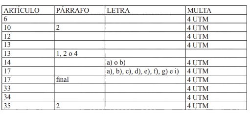 Artículo 47 Las infracciones a las normas de la presente Ordenanza serán clasificadas como Leves, Menos Graves y Graves, las cuales serán sancionadas con multas de tres (3), cuatro (4) y cinco (5) Unidades Tributarias mensuales vigentes, respectivamente, a la fecha del pago según la siguiente clasificación: