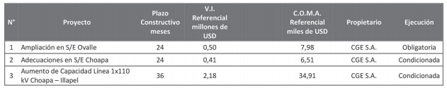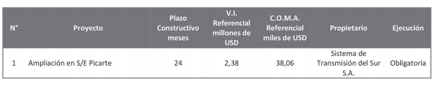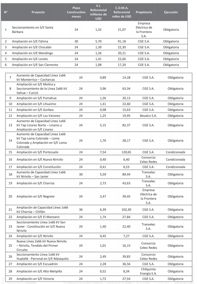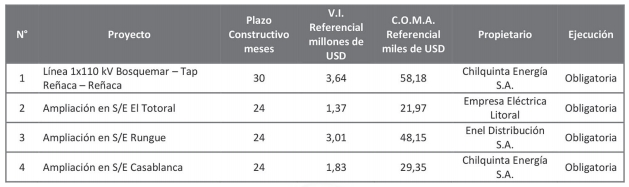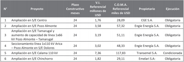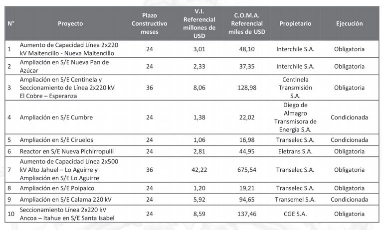 El siguiente cuadro presenta las obras de ampliación contenidas en el Plan de Expansión del Sistema de Transmisión Nacional, las que deberán dar inicio a su licitación, adjudicación y construcción, conforme se indica a continuación: