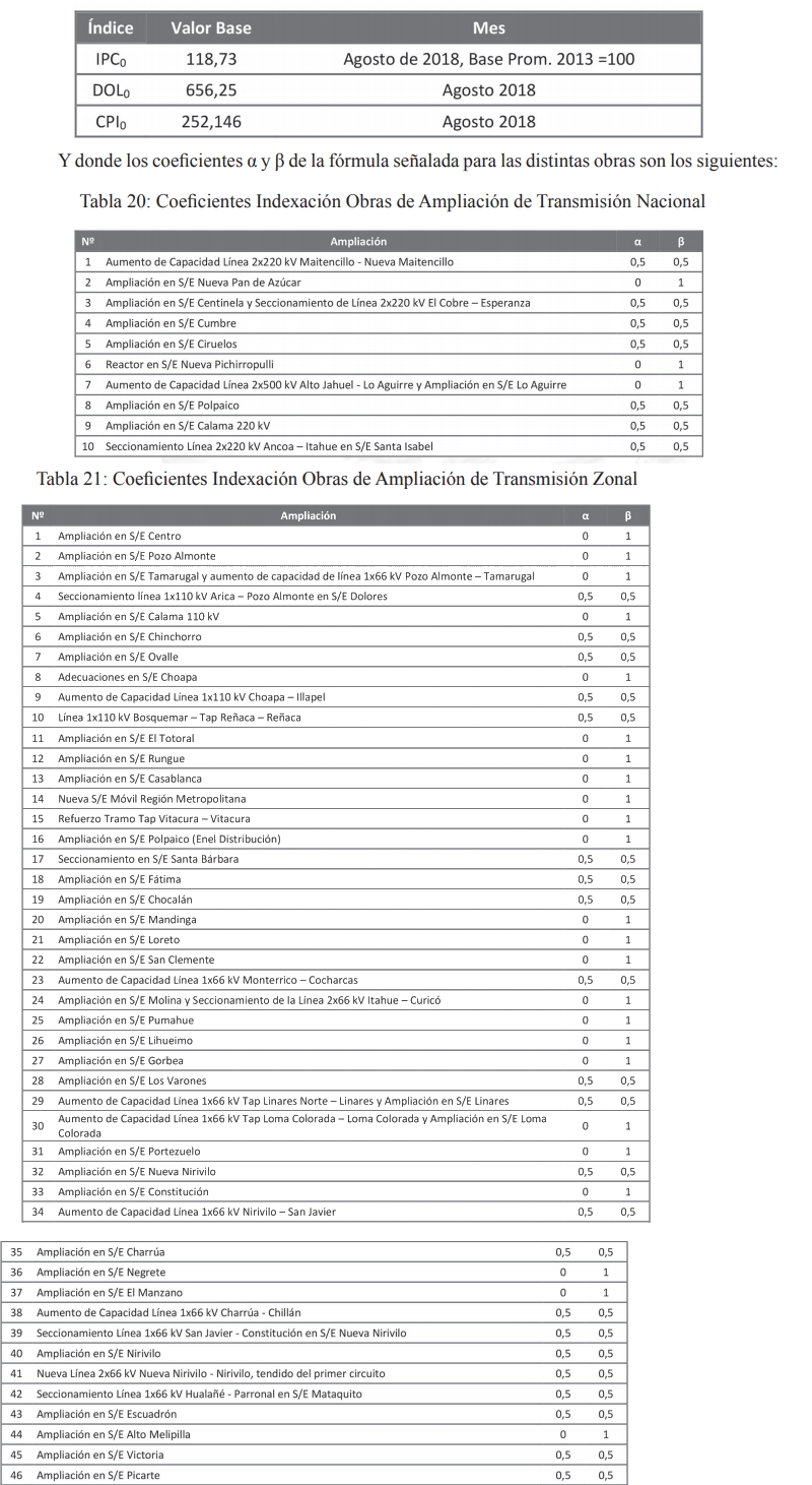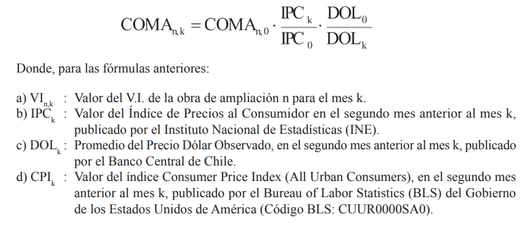 Las fórmulas de indexación aplicables a los V.I. y COMA referenciales de los proyectos contenidos en el Plan de Expansión son las siguientes: