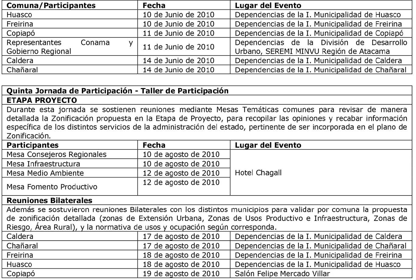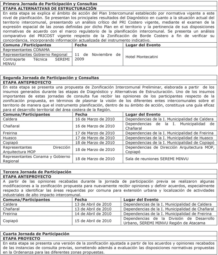 - La publicación en el Diario Atacama de fecha 07.09.2012 y su rectificación publicada en el mismo Diario en fecha 08.10.2012, que indica el Calendario, horarios de atención y lugar de Exposición y Consulta Pública de los antecedentes de la Actualización del Plan Regulador Intercomunal Costero de Atacama y su Informe Ambiental respectivo, así como el plazo y la forma en que el público interesado puede hacer sus observaciones.