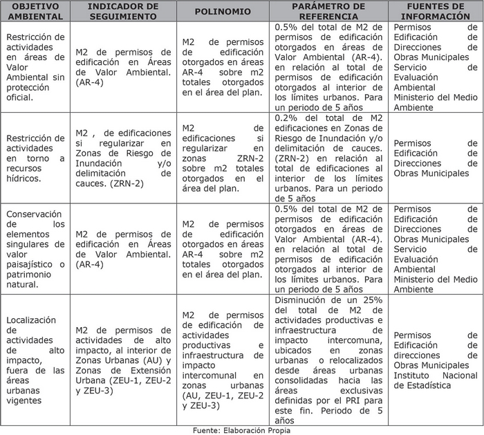 - El contenido del Informe Ambiental y las respectivas consideraciones ambientales y de desarrollo sustentable que incorpora el plan para su dictación, así como los criterios e indicadores de seguimiento destinados a controlar la eficacia del mismo, y los criterios e indicadores de rediseño que se deberán considerar para la reformulación de dicho plan en el mediano o largo plazo, es el siguiente:
