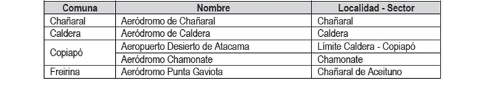 Aeródromo "Desierto de Atacama", de conformidad al decreto Nº 47 de fecha 3 de mayo de 2006 (D.O. 23.08.2006) del Ministerio de Defensa Nacional, que aprueba plano que determina zonas de protección.