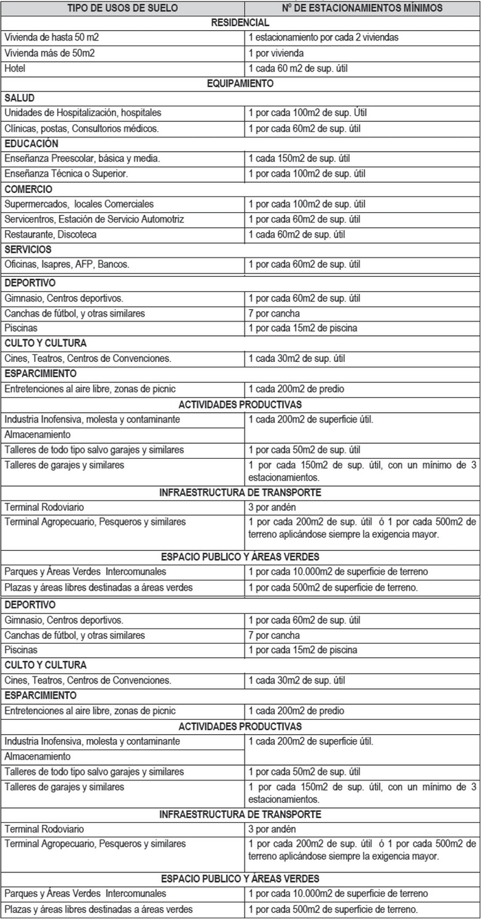 En las áreas que actualmente no se encuentran reguladas por Instrumentos de Planificación comunal, todos los proyectos de construcción y cambio de destino, deberán cumplir con las exigencias de estacionamientos, que se indican en el presente artículo.