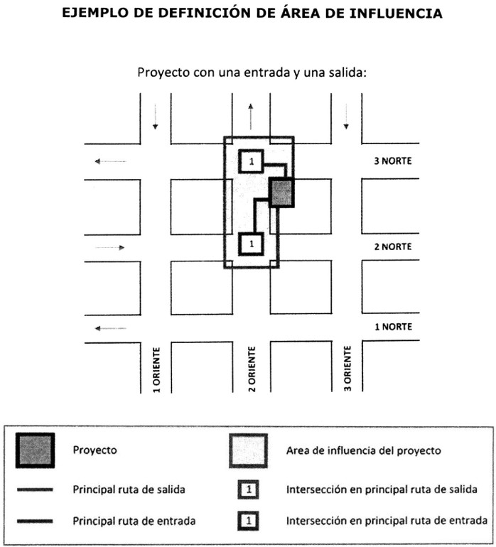 El área de influencia estará determinada por el espacio público contiguo al predio en que pretende emplazarse el proyecto, y por los tramos de vías que conectan cada uno de los accesos (entrada y salida) del proyecto con la primera intersección con otra vía principal, incluyendo la superficie ocupada por tales intersecciones. El área de influencia deberá presentarse en un esquema gráfico, tal como el ejemplo señalado en el Anexo II.