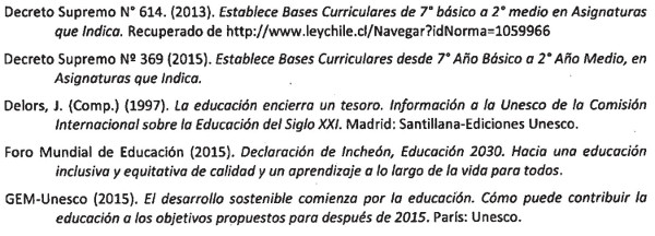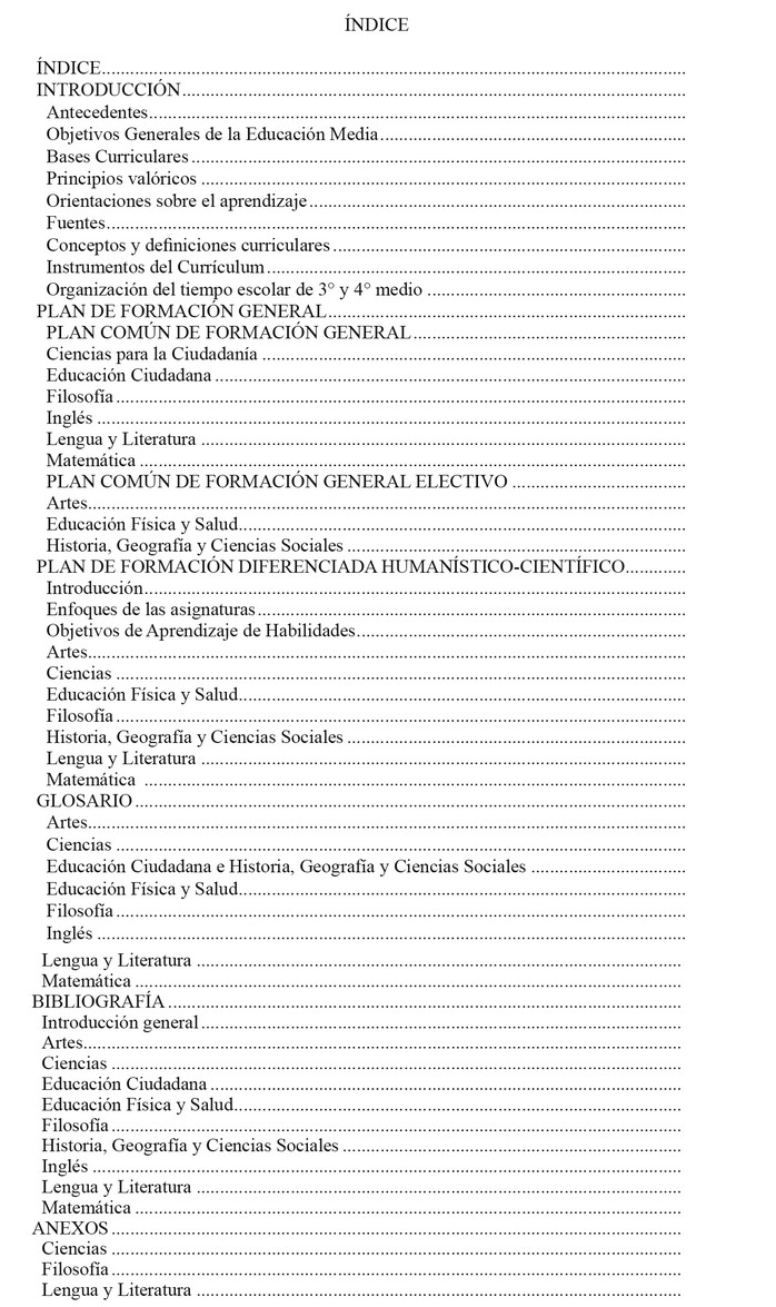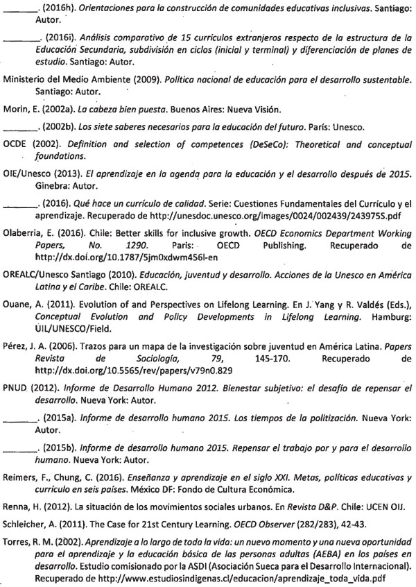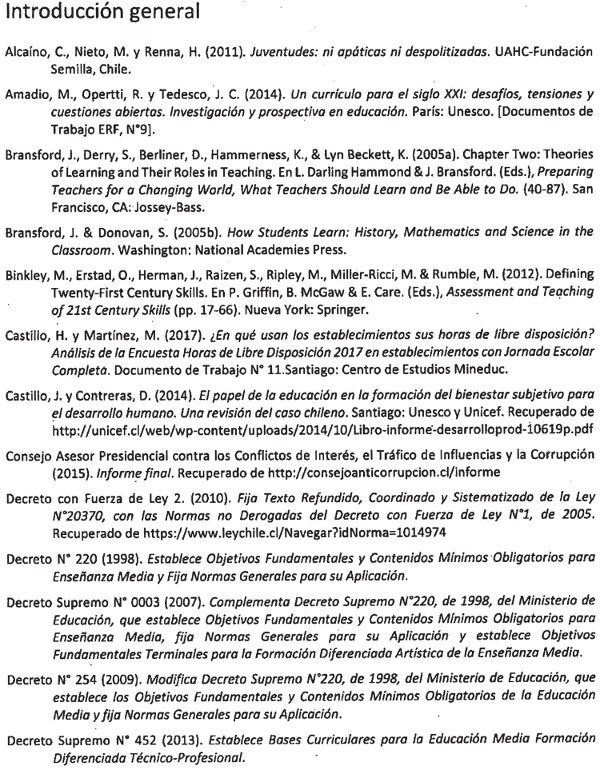 La definición curricular debe ser capaz, a la vez, de adecuarse a los cambios en los requerimientos formativos de la sociedad hacia las nuevas generaciones, como también a los nuevos marcos normativos que regulan el derecho a la educación en Chile. Como parte de esta actualización, a partir de la promulgación de la Ley General de Educación (Ley N°20.370) en el año 2009, el Ministerio de Educación ha impulsado un proceso de desarrollo curricular para los niveles educacionales correspondientes a Educación Básica y Educación Media. Así, en 2012, por medio de los Decretos N°433 y N°439, se establecieron las Bases Curriculares para los niveles de 1° a 6° básico. Luego, mediante los Decretos N°452 y N°614 de 2013 y N°369 de 2015, se establecieron las Bases Curriculares para la Formación Diferenciada Técnico-Profesional y para los niveles de 7° básico a 2° medio respectivamente, en las que se buscó resguardar la consistencia de la trayectoria formativa mediante un enfoque de continuidad en los criterios, en la concepción didáctica y en la estructura curricular de estos niveles. Las presentes Bases Curriculares de 3° y 4° medio mantienen dicha continuidad y consistencia.