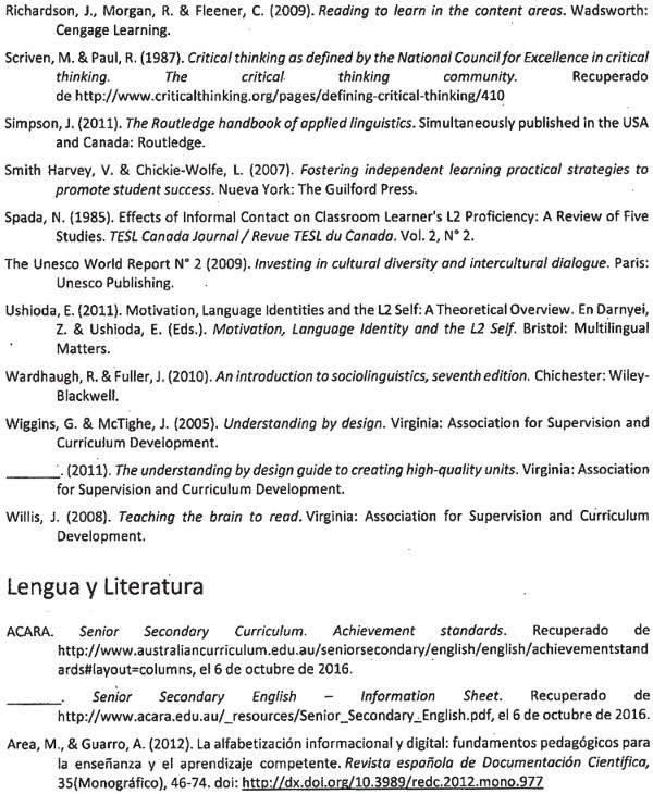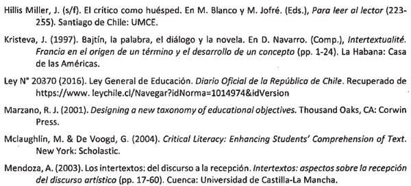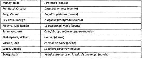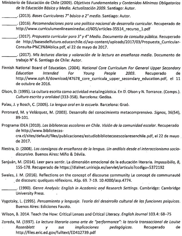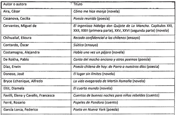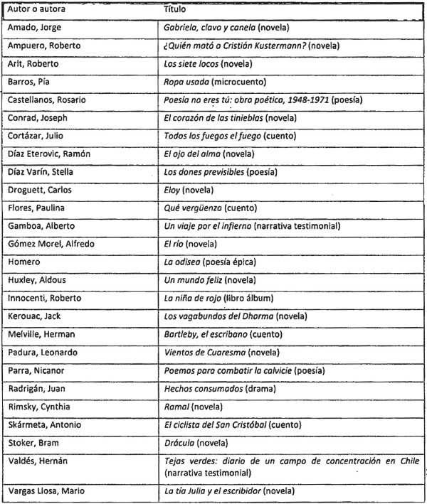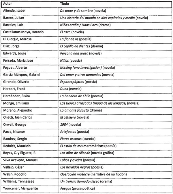 Las obras recomendadas se organizan en tres grupos temáticos para 3° medio y tres para 4° medio, y fueron clasificadas según cuatro criterios: 1. Obras relacionadas con la realidad local; 2. Obras de la literatura chilena contemporánea (1970-2015); 3. Obras que amplían el conocimiento de la realidad latinoamericana y de la literatura mundial; 4. Obras que respondan a los intereses de los estudiantes. Igualmente, se resguarda la presencia equilibrada de autores y autoras, así como de los diferentes géneros literarios.