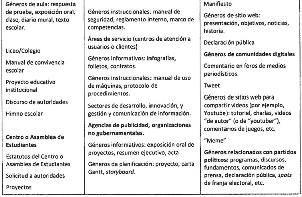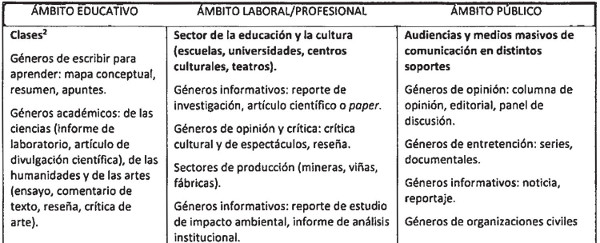 A continuación, se presenta ejemplos de géneros discursivos pertinentes para desarrollar la lectura crítica. Son géneros propios del ámbito educativo, laboral y público1, de manera que los estudiantes tengan la oportunidad de analizar textos que presenten la complejidad adecuada para poder desarrollar las habilidades descritas en estas Bases. No obstante, la incorporación de esta tabla no impide que los docentes seleccionen otros géneros que consideren pertinentes.