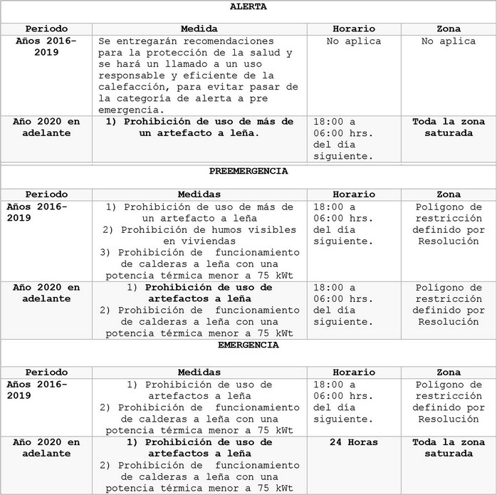 2.- Que, el PDA Temuco dispone en su Capítulo VII "Plan operacional para la gestión de episodios críticos", distintas medidas aplicadas al sector residencial que a partir del año 2020 se volverán más restrictivas y con una mayor cobertura según se ilustra en la siguiente tabla: