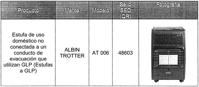 PROHÍBE, TRANSITORIAMENTE, LA COMERCIALIZACIÓN DE LOS PRODUCTOS "ESTUFA DE USO DOMÉSTICO NO CONECTADA A UN CONDUCTO DE EVACUACIÓN QUE UTILIZAN GLP (ESTUFAS A GLP)", MARCA ALBIN TROTTER, MODELO AT 006, SELLO SEC (QR) Nº 48603