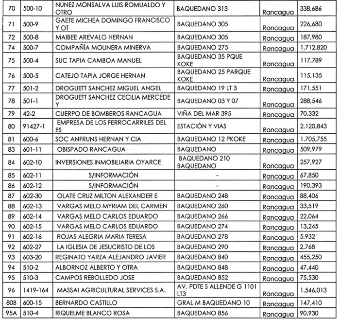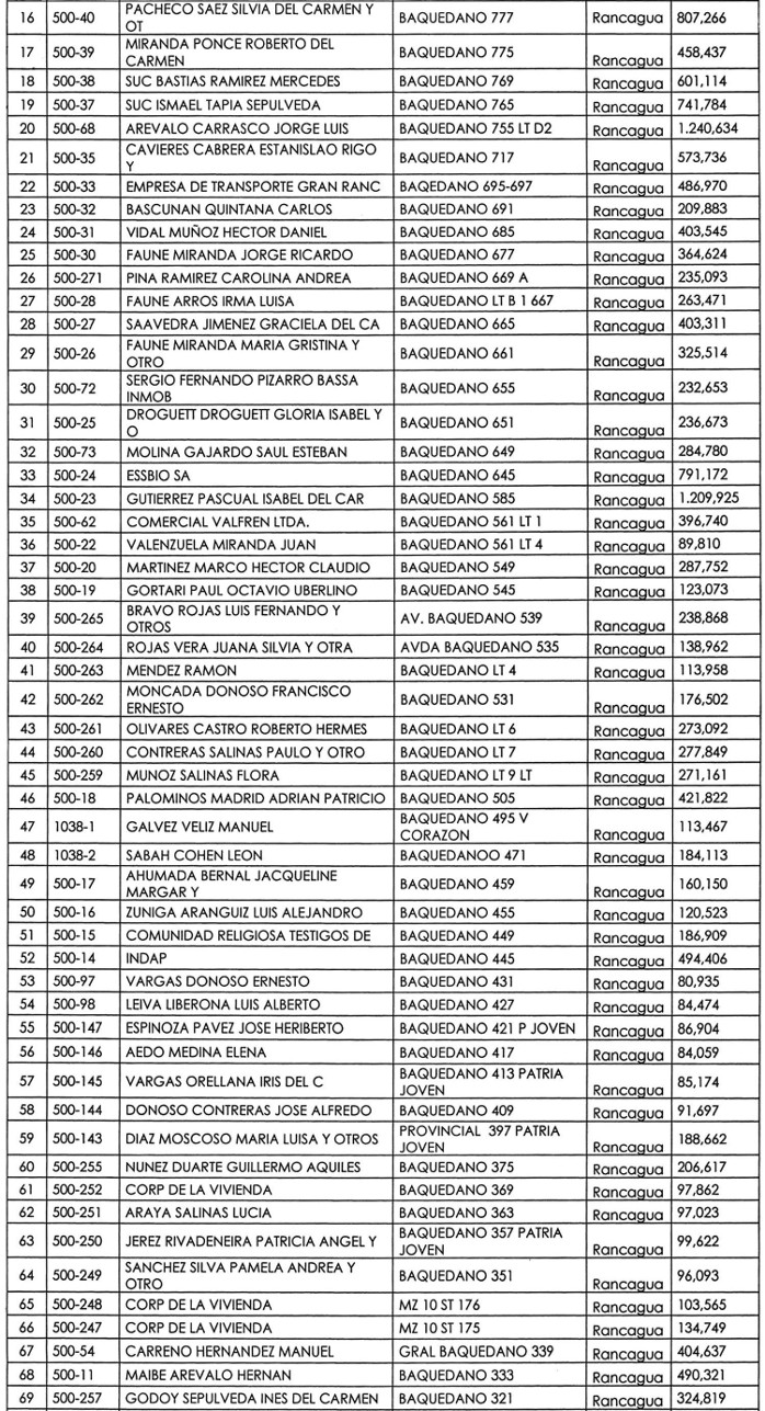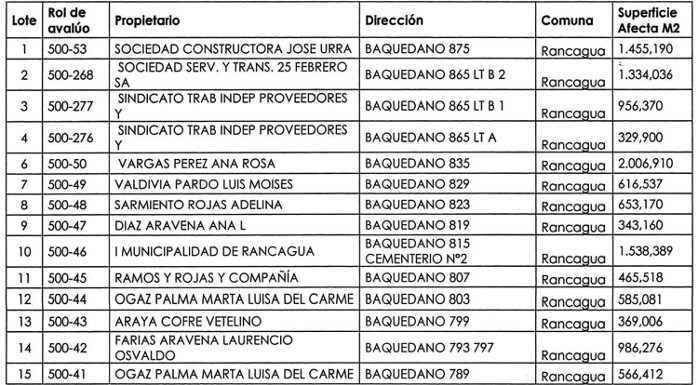 1º.- Apruébase el programa de expropiaciones para la ejecución del proyecto de vialidad denominado "Ampliación Avenida Baquedano, Rancagua", Código BIP 30118748-0, que comprende los lotes de la comuna de Rancagua, señalados en el Plano "Planta de Expropiaciones", láminas 1 al 4, elaborados por el Serviu Región de O'Higgins a escala 1:500, de diciembre de 2018, que se especifican a continuación: