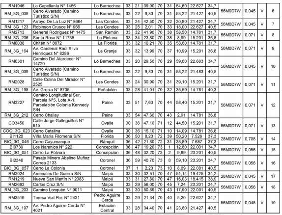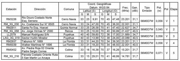 1.- Autorízase a la concesionaria para instalar, operar y explotar diecinueve (19) radioenlaces, en las Regiones Metropolitana de Santiago, de Los Lagos, de Coquimbo, del Biobío y de Ñuble, según se indica a continuación:
