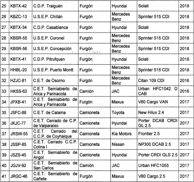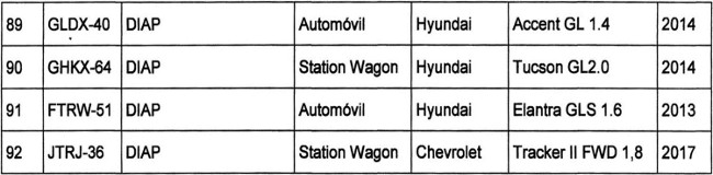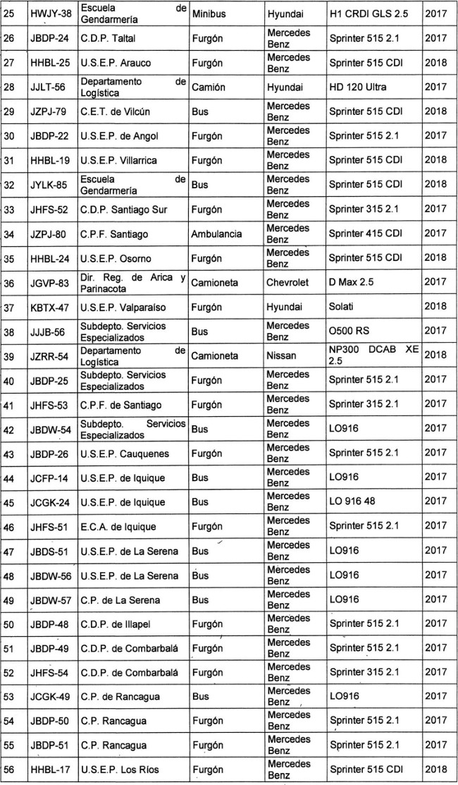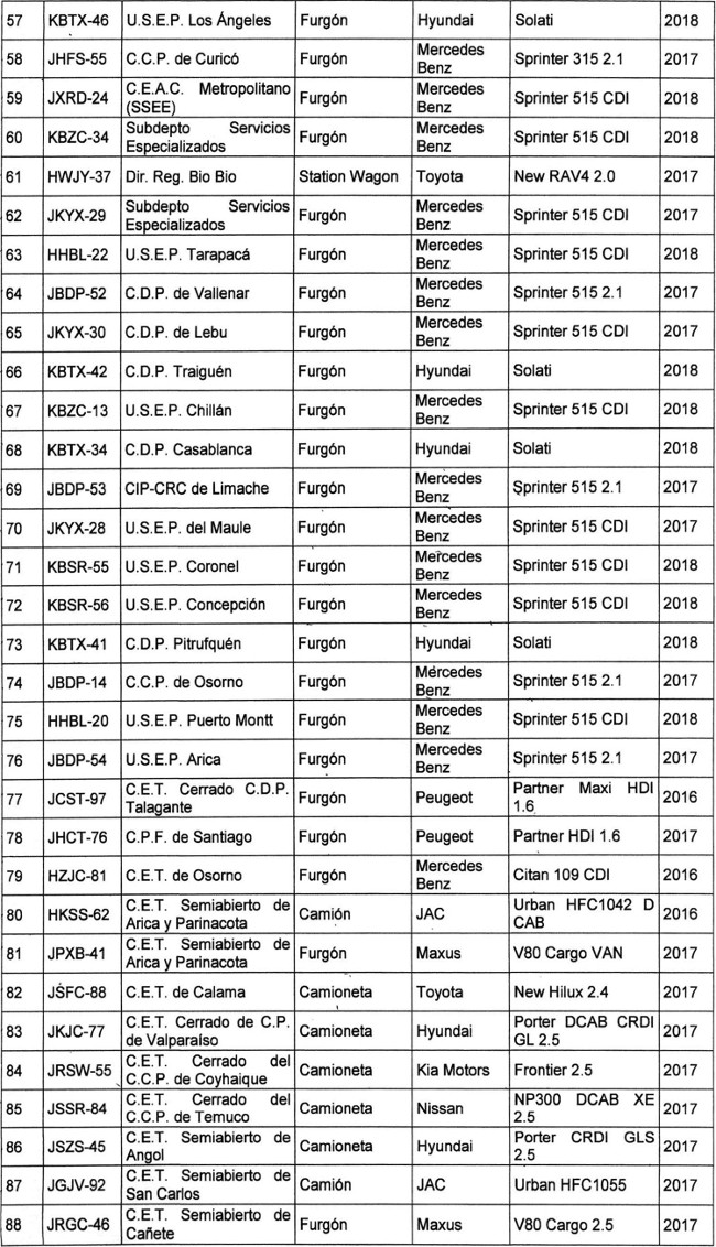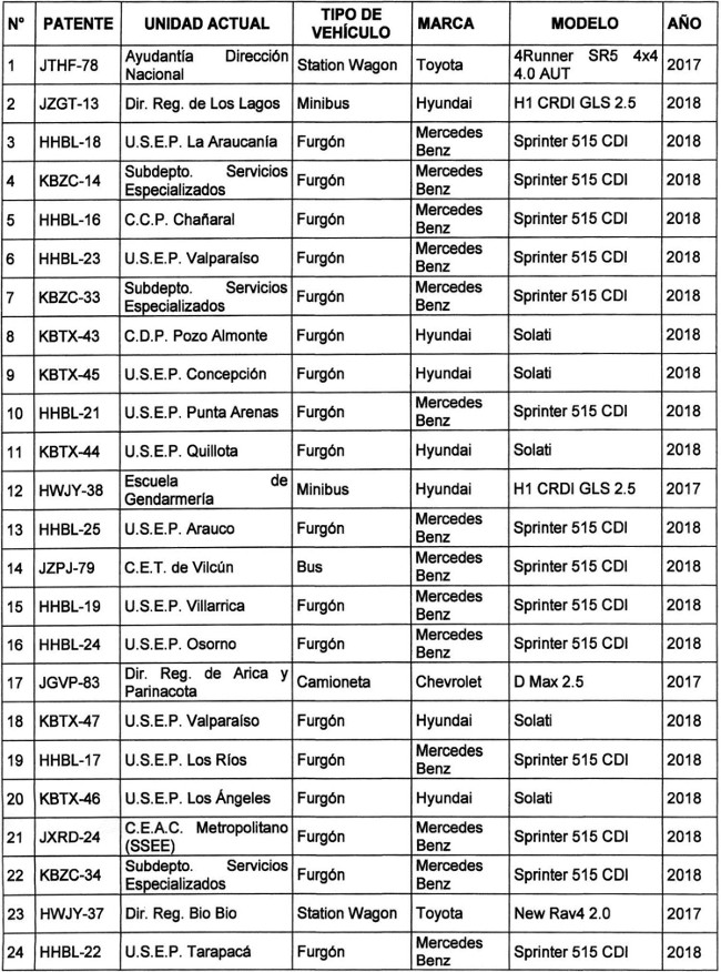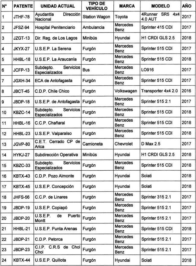 1º.- Autorízase la circulación en horario inhábil y en los días sábados en la tarde, domingos y festivos de los vehículos destinados al uso de Gendarmería de Chile, que a continuación se indican: