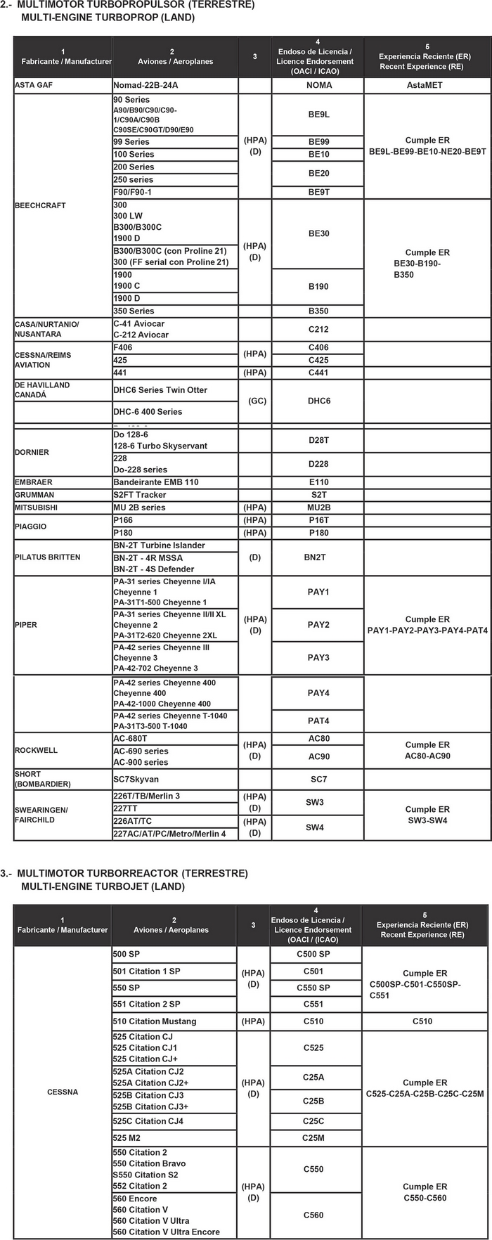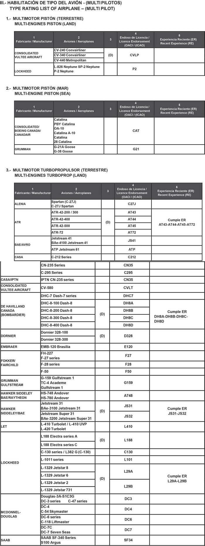(iii) En la columna 5, se ha definido qué habilitaciones sin ser Familia de aeronaves, pueden cumplir el requisito de experiencia reciente al volar una o más aeronaves. Debido a esto se han definido qué habilitaciones de tipo que se pueden unir solo bajo el concepto de cumplimiento de la experiencia reciente. Cuando un piloto tiene más de una habilitación de tipo y está ésta incorporada en la licencia del piloto. Ej.: si el piloto tiene la habilitación de tipo BE9L y luego obtiene la habilitación de tipo BE20, la obtención es separada, pero la mantención para la experiencia reciente es junta, es decir, si durante 90 días solo se voló en BE9L, esa experiencia de vuelo también es asimilable a BE20. Por lo tanto, el cumplimiento cada 90 días para pilotos comerciales, MPL y TLA; y 180 días para pilotos privados, planeador y globo libre se podrá efectuar para mantener ciertas habilitaciones de tipo, cumpliendo una habilitación o una combinación de ellas.