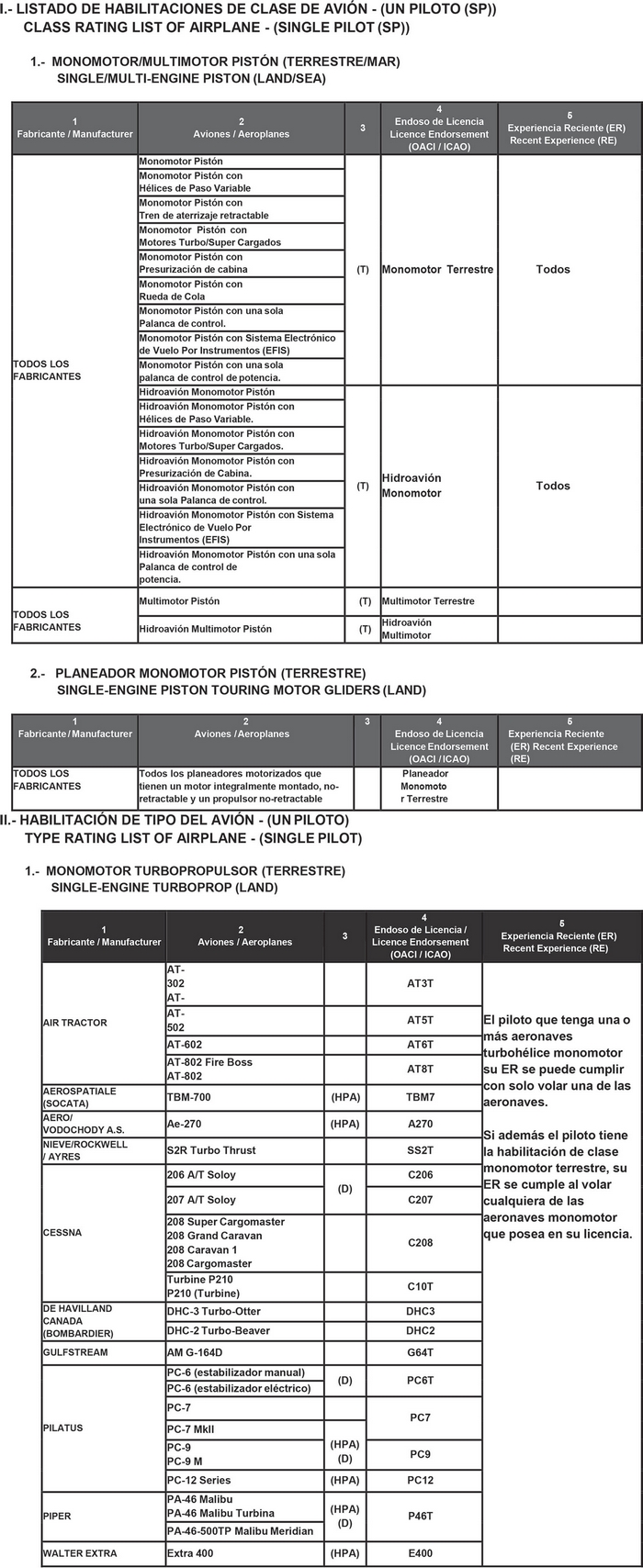 LISTADO Y ENDOSO HABILITACIONES DE CLASE Y TIPO DE AVIONES PARA SU UTILIZACIÓN EN CHILE Y EL EXTRANJERO