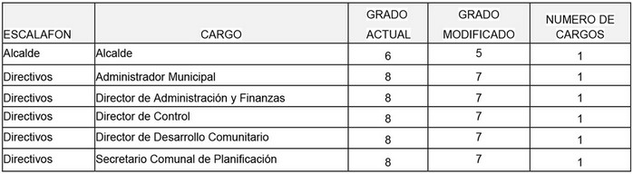 14. La ley Nº 20.033, de fecha 23.06.2005, que en su artículo 7º señala "Reemplázase en las correspondientes plantas del personal municipal, los actuales grados 7 asignados a Alcaldes, por grados 6, modificándose de pleno derecho, para tal efecto, los respectivos decretos con fuerza de ley. Lo establecido en el presente artículo no implicará, en caso alguno, una modificación en la adscripción de los restantes grados de las escalas de personal de las respectivas municipalidades".