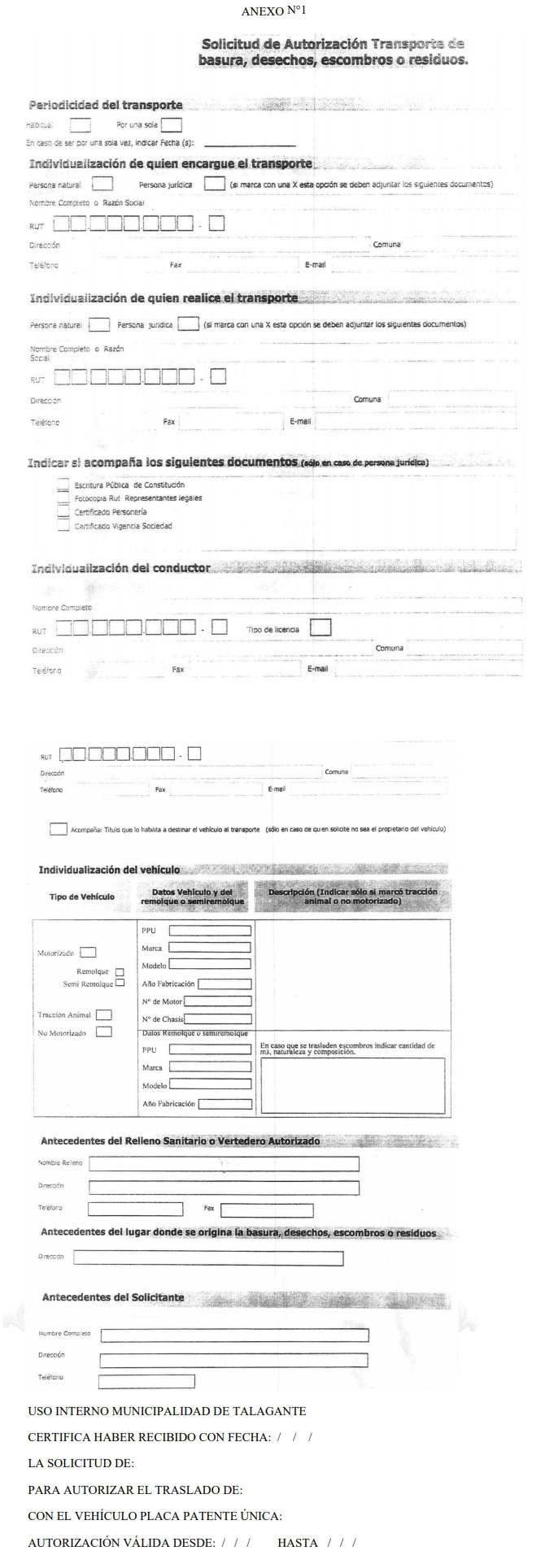 Artículo 12° La solicitud para transportar basura, desechos, escombros o residuos, sea que éste se efectúe por una sola vez, en forma habitual o por el tiempo que dure la obra, tratándose de empresas constructoras o inmobiliarias, se realizará mediante un formulario que la Dirección de Medio Ambiente, Aseo y Ornato, pondrá a disposición de los interesados. Para el otorgamiento de la respectiva autorización, se deberá completar el "Formulario de autorización: Transporte de basuras, desechos, escombros o residuos, contenido en Anexo 1" de la presente Ordenanza.