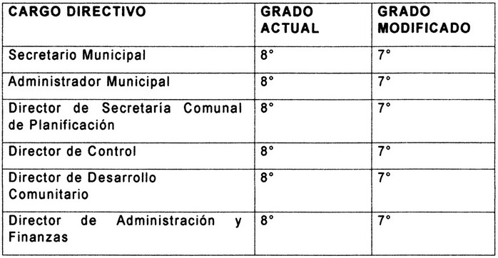Artículo 2: Por la aplicación del ajuste de grado al cargo de Alcalde definido en el artículo anterior de conformidad a lo dispuesto en los artículos 16 y 49 bis, inciso tercero numeral 9 de la Ley Nº 18.695. Orgánica Constitucional de Municipalidades, ajústense los grados de los cargos directivos que luego se indican: