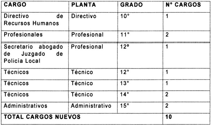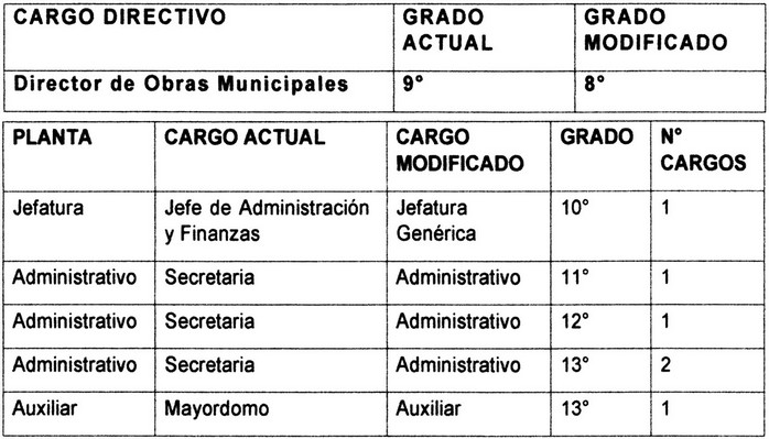Artículo 1: Ajústese el actual grado en la planta de personal de esta Municipalidad del Cargo de Alcalde, pasando de 6º a 5º.