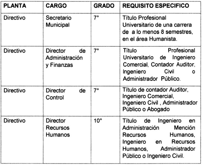 . Artículo 7: De conformidad a la facultad que entrega el artículo 8 de la Ley Nº 18.883, Estatuto Administrativo de los Funcionarios Municipales, fíjense los siguientes requisitos específicos para los cargos que se señalan:
