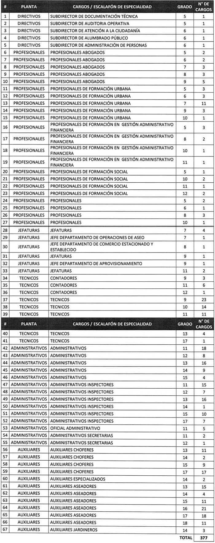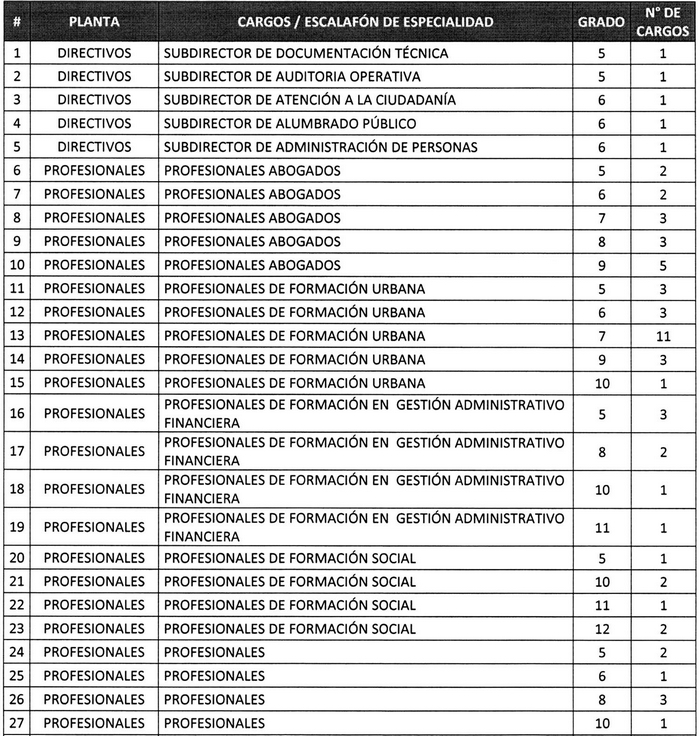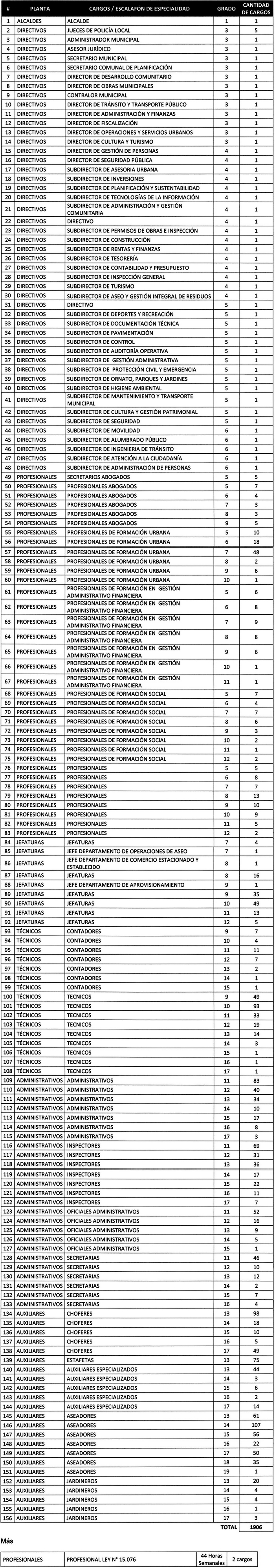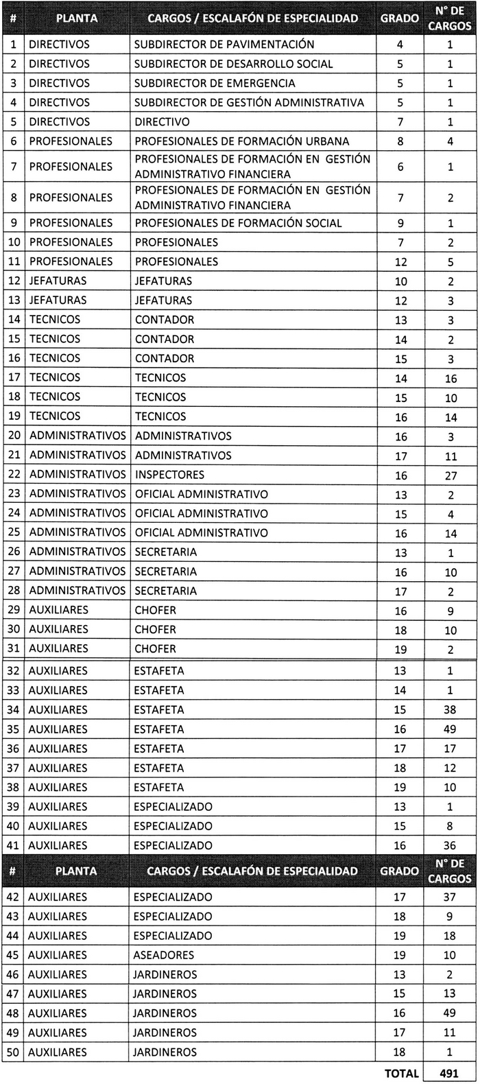Artículo 8º: Establécese la planta de personal de la Municipalidad de Santiago, la que se compondrá del número de cargos o escalafón de especialidad y sus correspondientes grados que a continuación se indican: