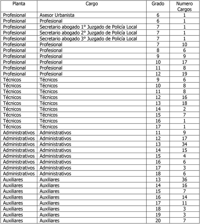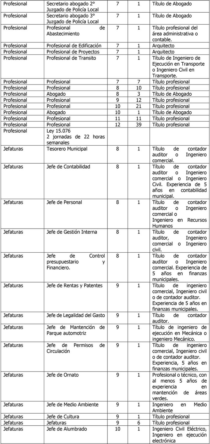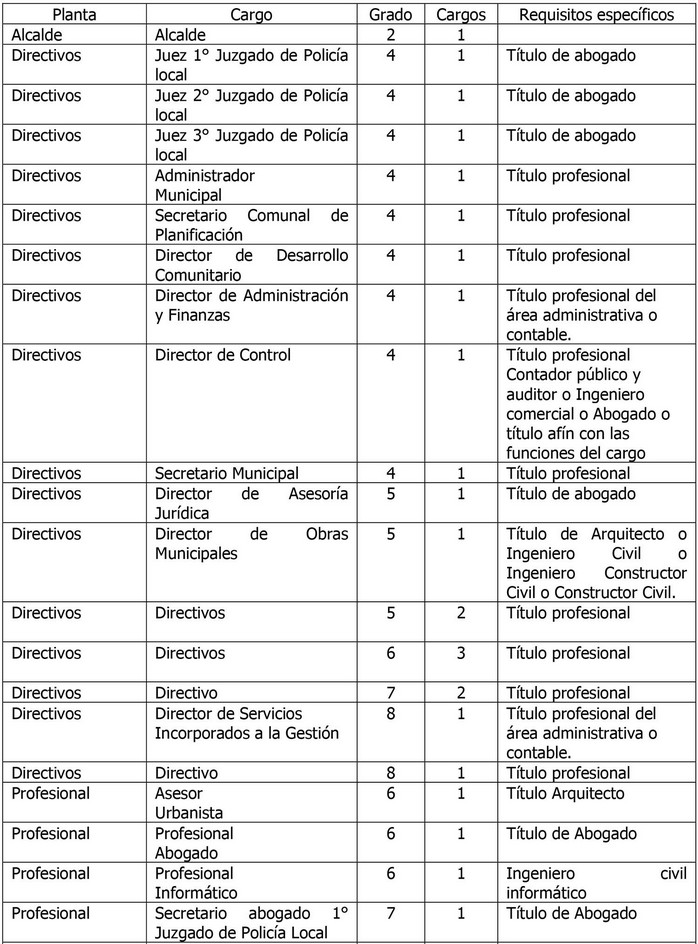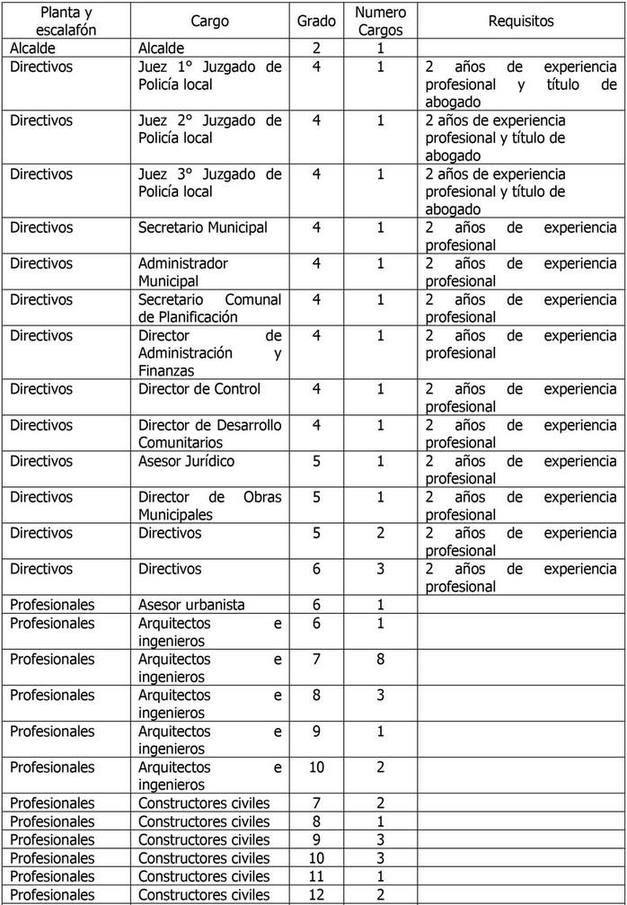 . Artículo 6º: Fíjase la Planta del personal de la Municipalidad de Temuco, la que estará formada por los cargos y grados que se indican, con su correspondiente nominación y requisitos específicos que se señalan: