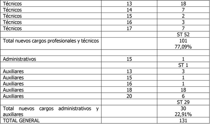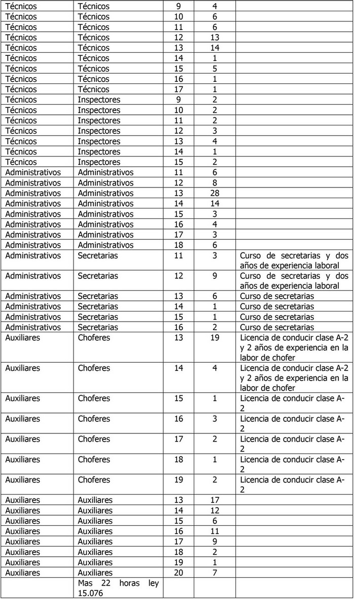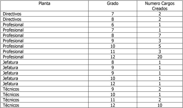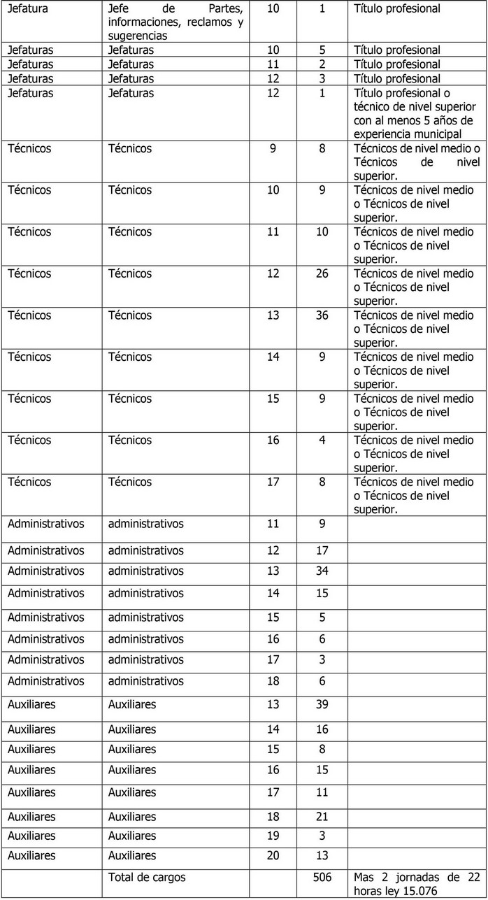 . Artículo 5º: Créanse los siguientes cargos, en las plantas directivos, profesionales, jefaturas, técnicos, administrativos y auxiliares con los grados que se indican, dentro del rango del 75% de personal profesional y técnico, de acuerdo con el Nº 4 del artículo 49 bis de la ley Nº 20.922. Déjase establecido que los cargos técnicos creados, deberán cumplir con los requisitos de poseer título técnico de nivel medio o título técnico de nivel superior: