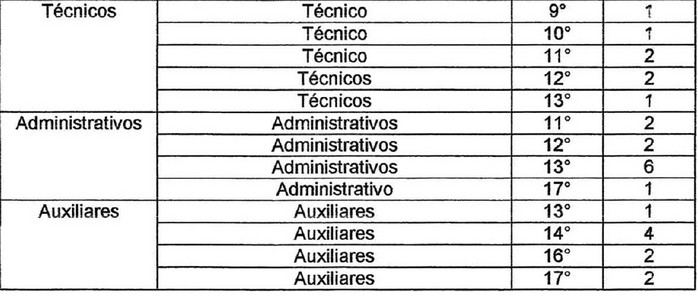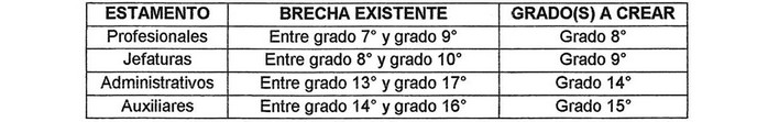 17. Que, las mencionadas "brechas de grado" se presentan en el cuadro siguiente y que, en consecuencia, se crearán los grados que permitan dar continuidad lógica a cada estamento:
