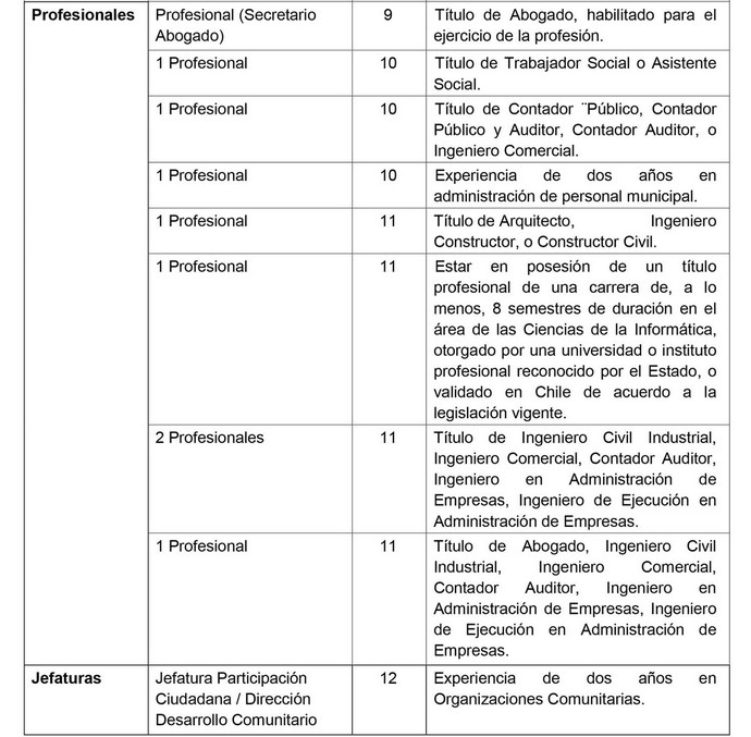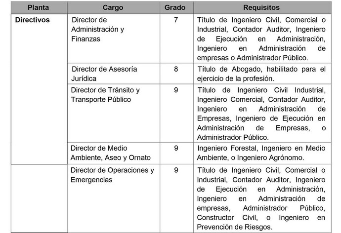 Artículo 5º: Establécese, requisitos específicos, sin perjuicio de los establecidos en el artículo 8º de la Ley Nº 18.883, Estatuto Administrativo de los Funcionarios Municipales, para el desempeño de los siguientes cargos: