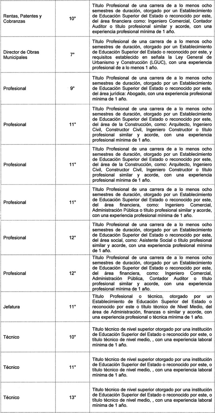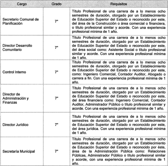A su vez, el artículo 8° del Estatuto Administrativo para Funcionarios Municipales, señala que tipos requisitos específicos deben cumplir los cargos de direcciones destinados al mando superior de las unidades de obras municipales y asesoría jurídica. Tratándose del cargo de Director de Obras Municipales, los requisitos específicos son: poseer título de arquitecto, de ingeniero civil, de ingeniero constructor civil o de constructor civil, otorgado por una institución de educación superior del Estado o reconocida por éste.