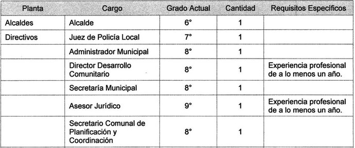 En virtud del reconocimiento legal que posee el cargo de Dirección Jurídica, y con la finalidad de equiparar su nivel remuneratorio al de las demás plazas equivalentes en la planta Directivos, se modifica desde su actual grado Directivo 9° pasando a ubicarse en grado 7°, en razón de la indispensable demanda de sus servicios y trámites en defensa de los intereses del municipio, regido por el derecho público en su actuar. Teniendo presente además, que es una Dirección de carácter unipersonal, la que eventualmente, por orden del Alcalde podrá ejecutar procedimientos disciplinarios que afecten al resto de los funcionarios directivos del Municipio, para lo cual debe ostentar, al menos, el mismo grado que ellos.