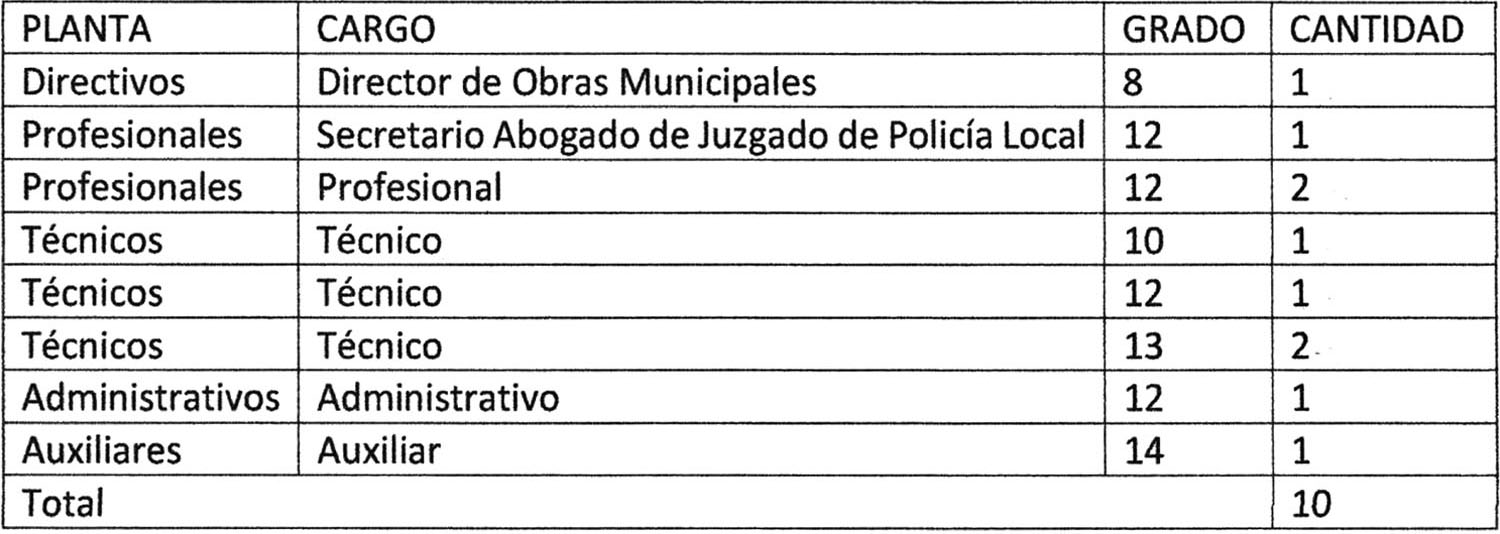 8.- De los 10 cargos creados, 4 requieren como requisito obligatorio título profesional, 4 título técnico, uno corresponde a un cargo administrativo y uno corresponde a un cargo auxiliar. Lo anterior en cumplimiento del Art. 49 bis número 4 de la ley Nº 18.695, Orgánica Constitucional de Municipalidades, en cuanto que "En caso que se incremente el número total de cargos en la planta de personal, a lo menos un 75% (setenta y cinco por ciento) de los nuevos cargos que se creen deberán requerir título profesional o técnico."