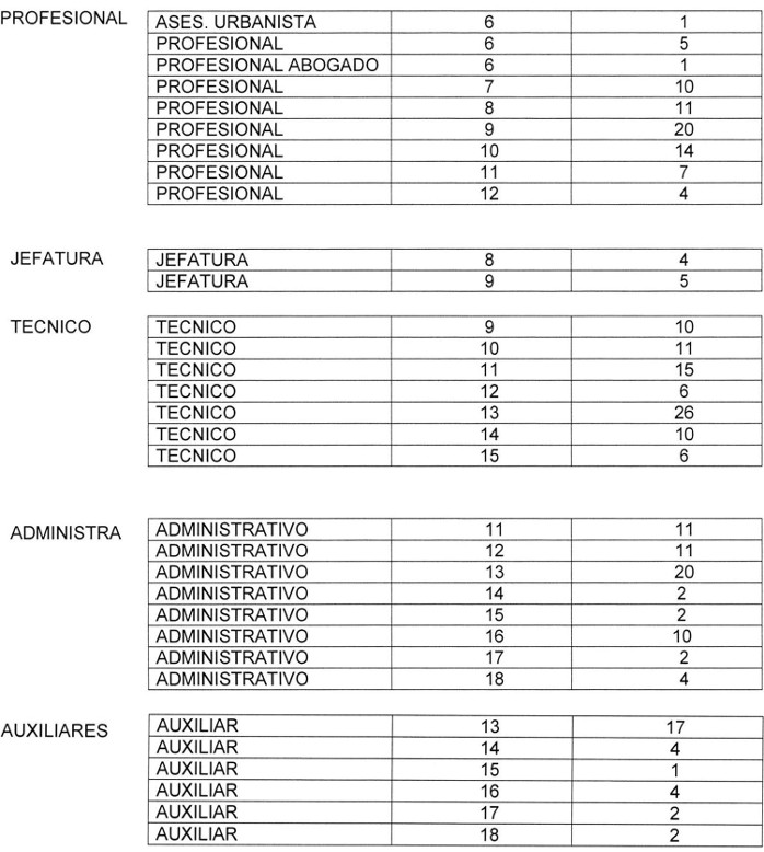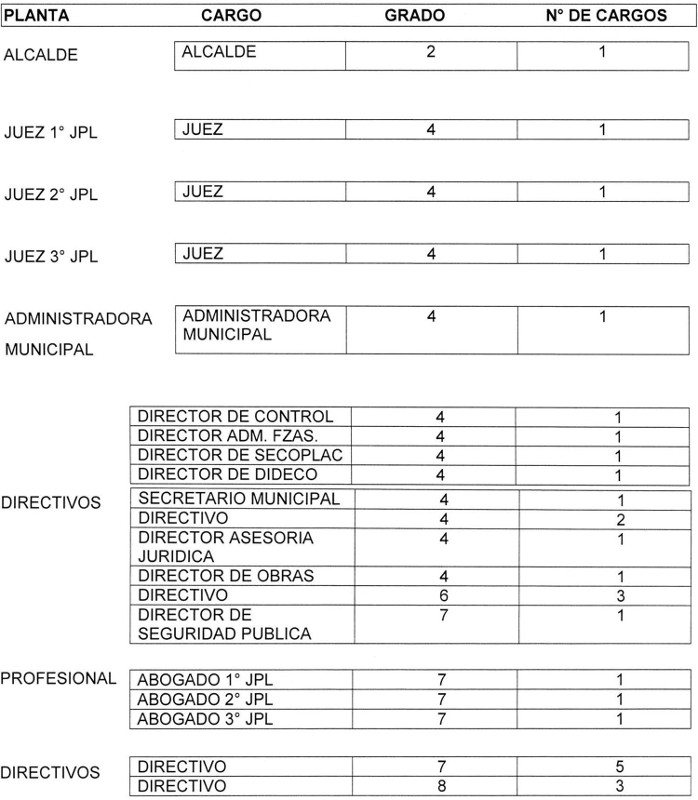 8. Que, para los efectos de la carrera funcionaria, cada municipalidad sólo podrá tener las siguientes plantas de personal: de Directivos, de Profesionales, de Jefaturas, de Técnicos, de Administrativos y de Auxiliares y dichas plantas municipales tendrán las siguientes posiciones relativas: